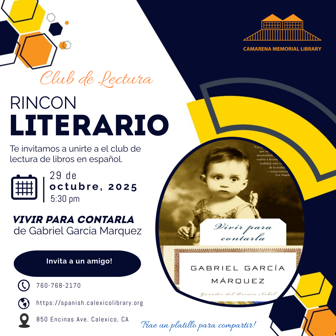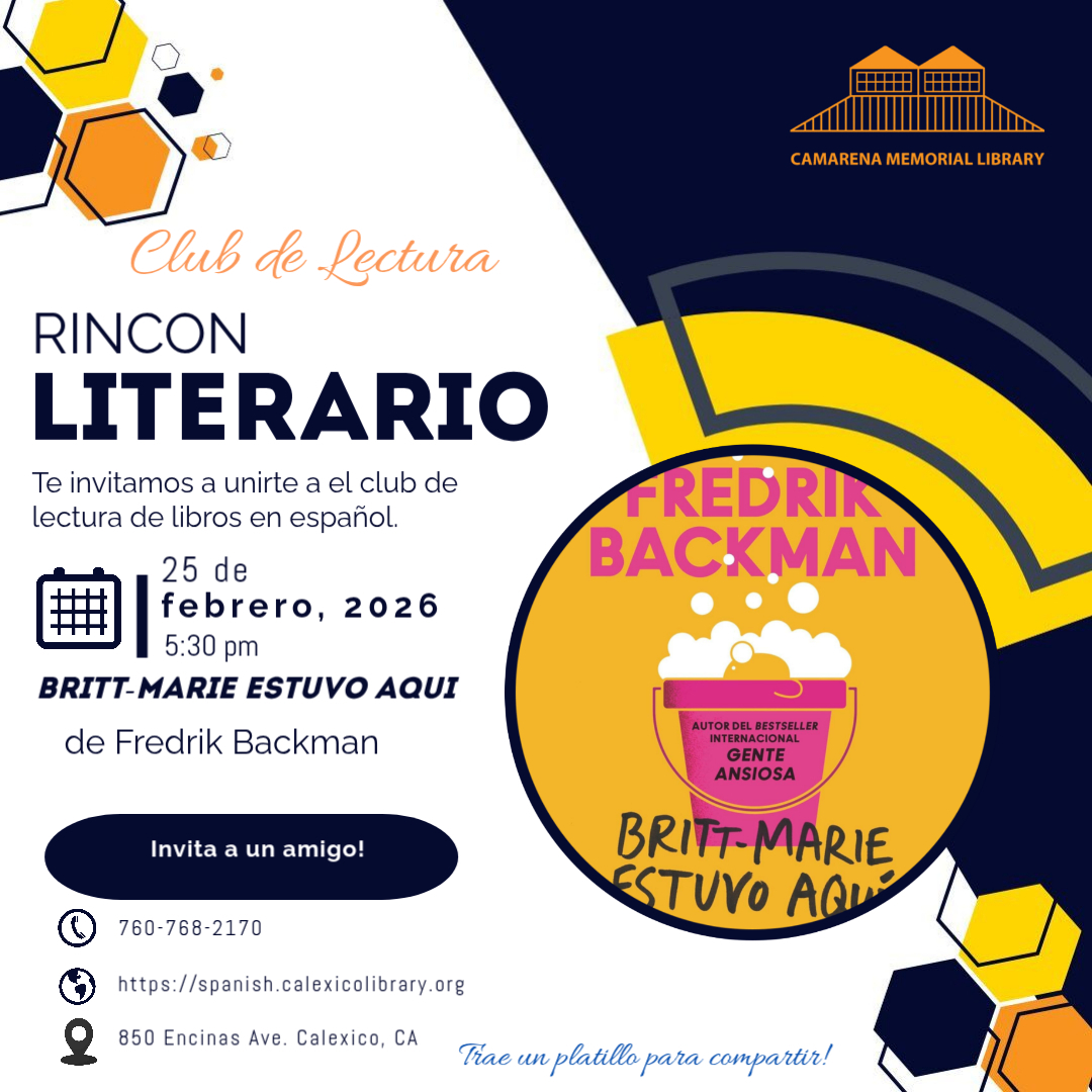Estás invitado a unirte al nuevo Club de Lectura Rincon Literario. Las reuniones se llevarán a cabo el último miércoles del mes a las 5:30 p.m. Es una comida compartida. Trae un platillo para compartir con el grupo. Puedes acceder a la selección de libros electrónicos y/o audiolibros mediante Hoopla Digital. Es posible que haya una copia del título disponible en la biblioteca para préstamo.
