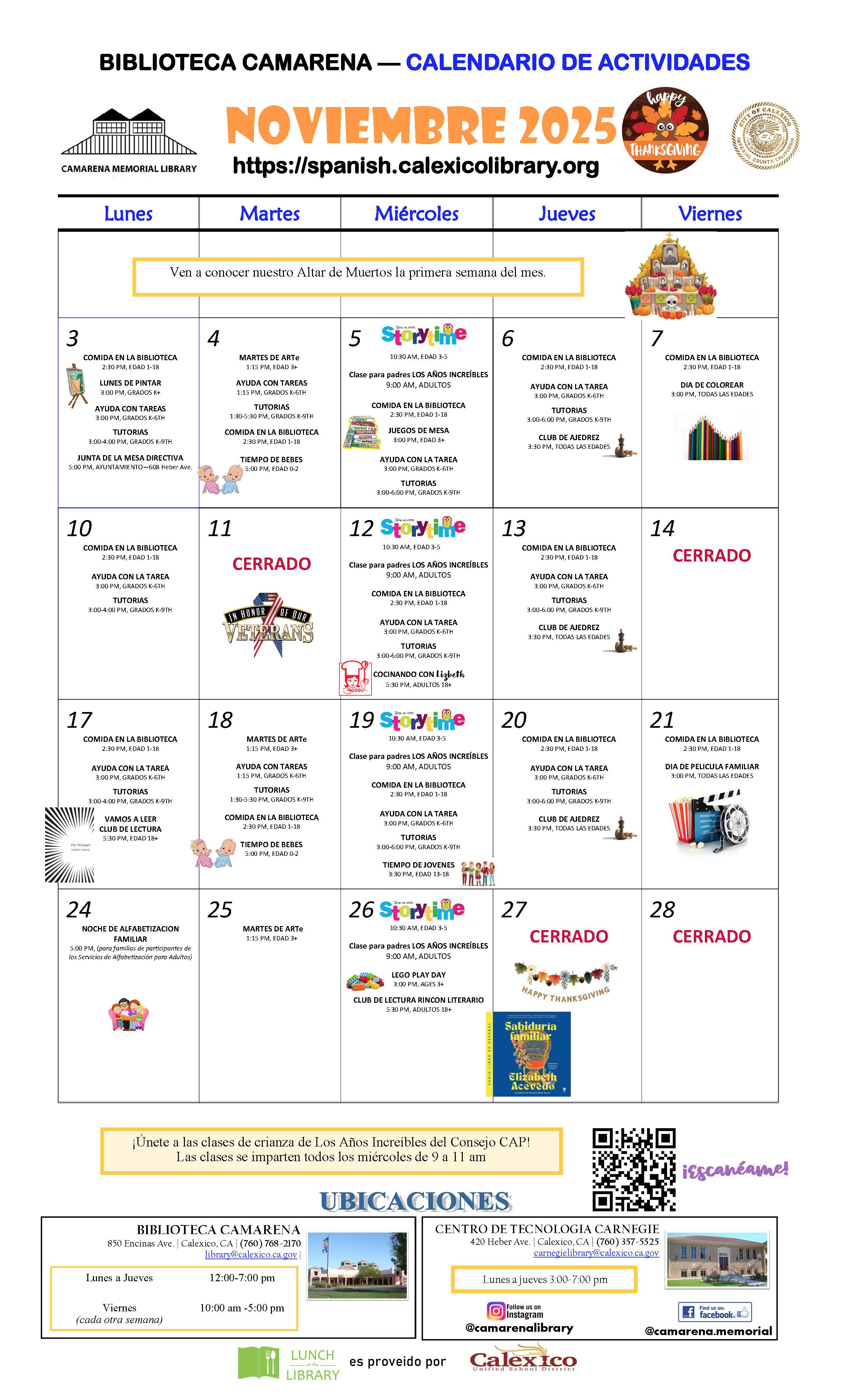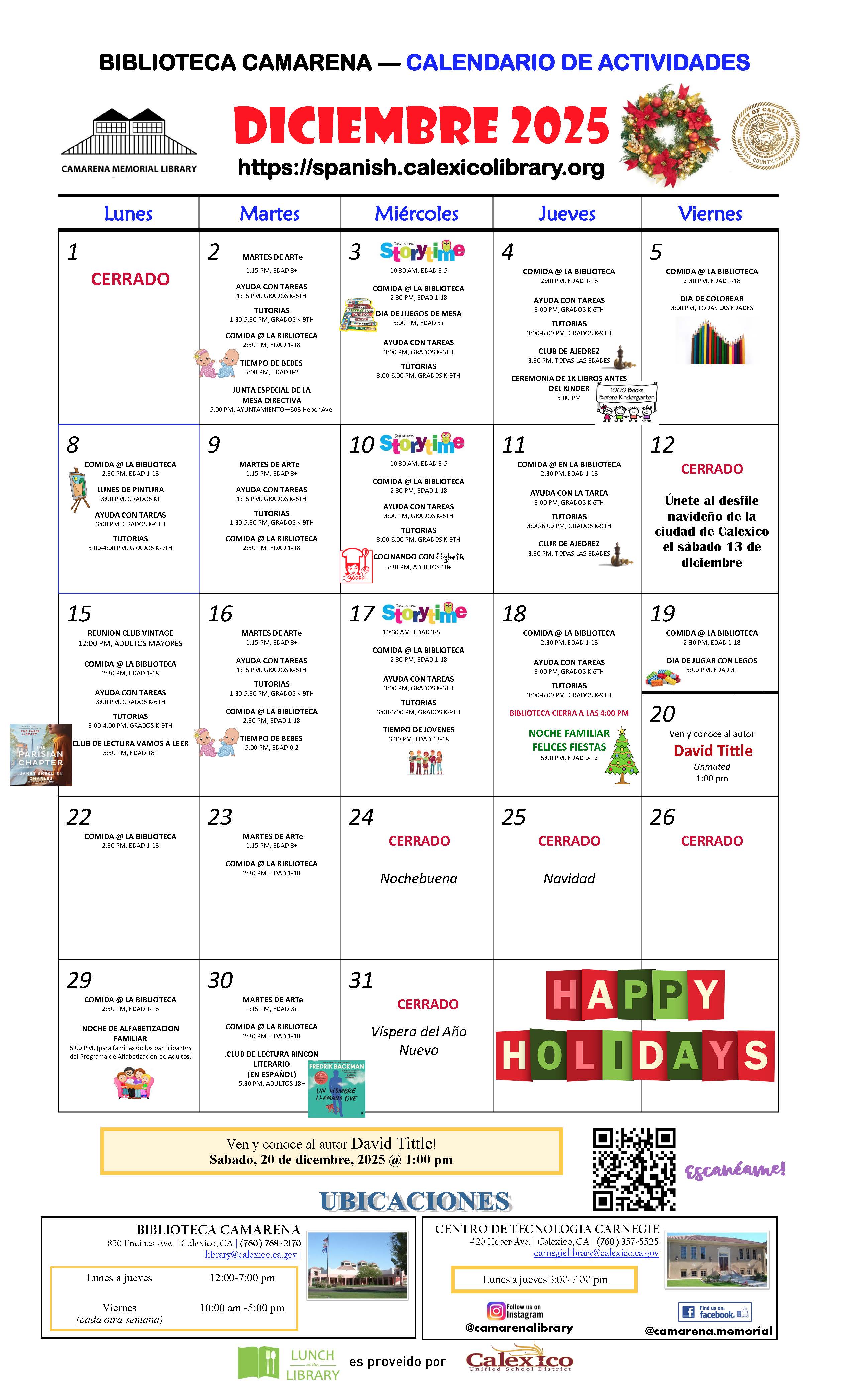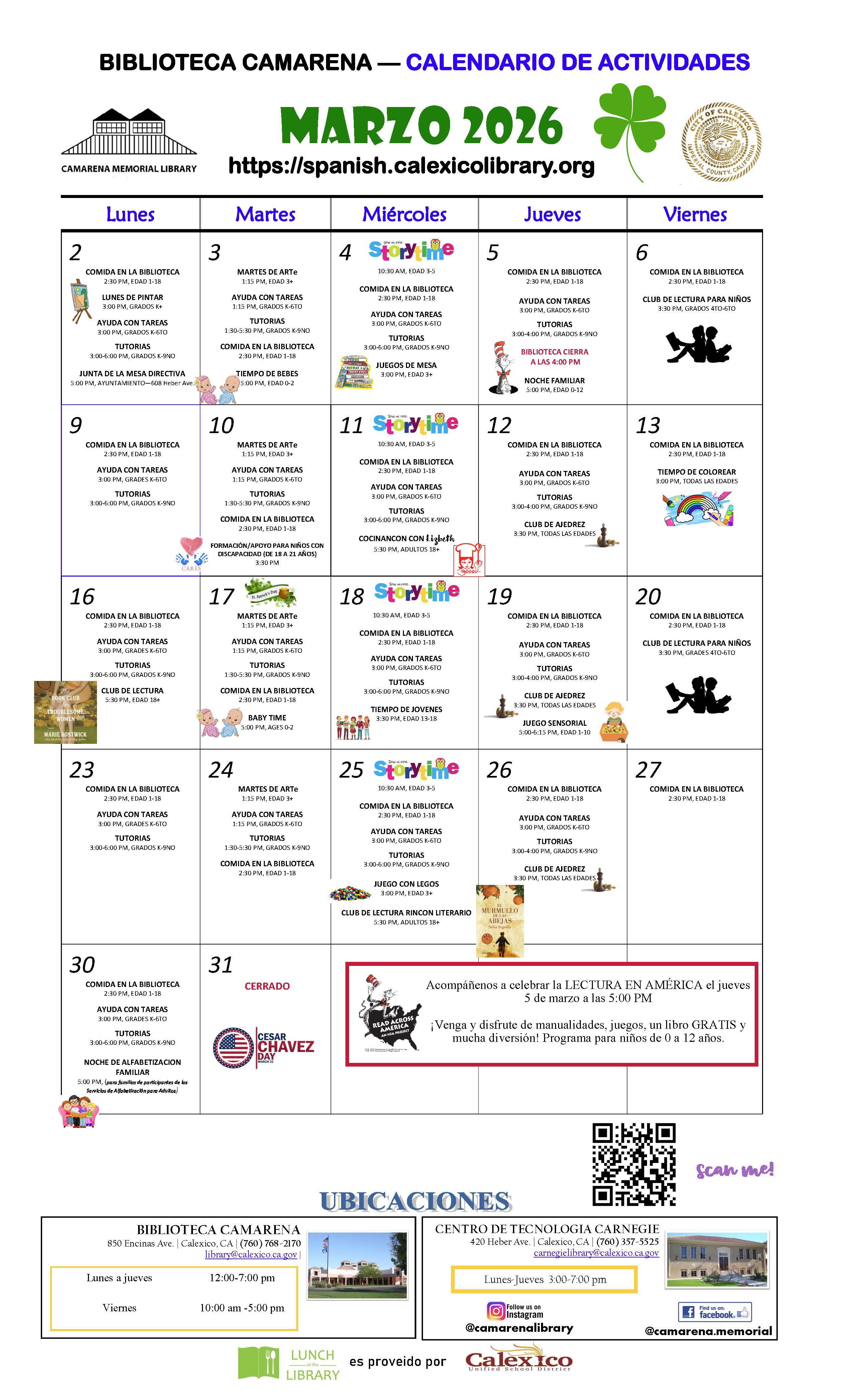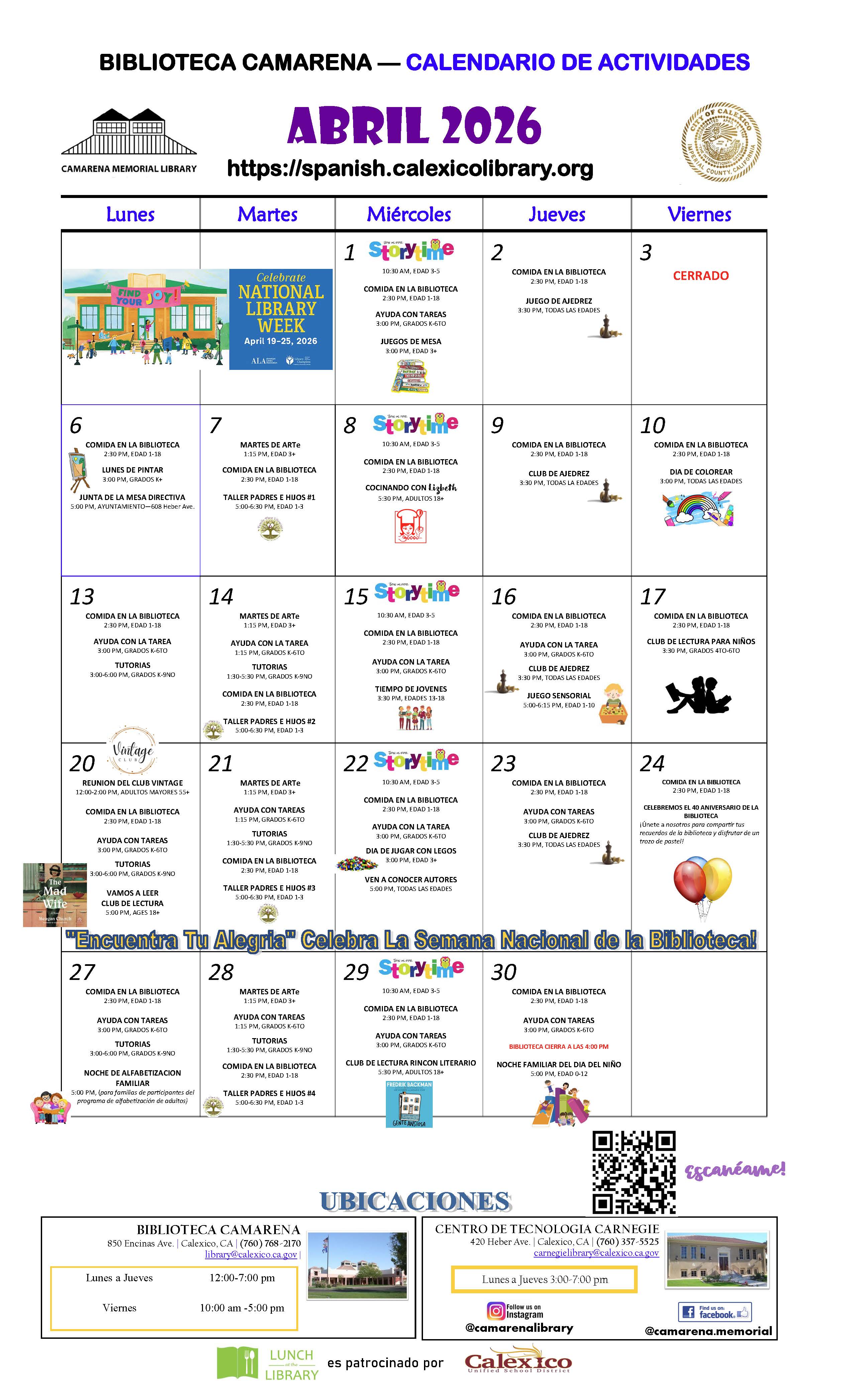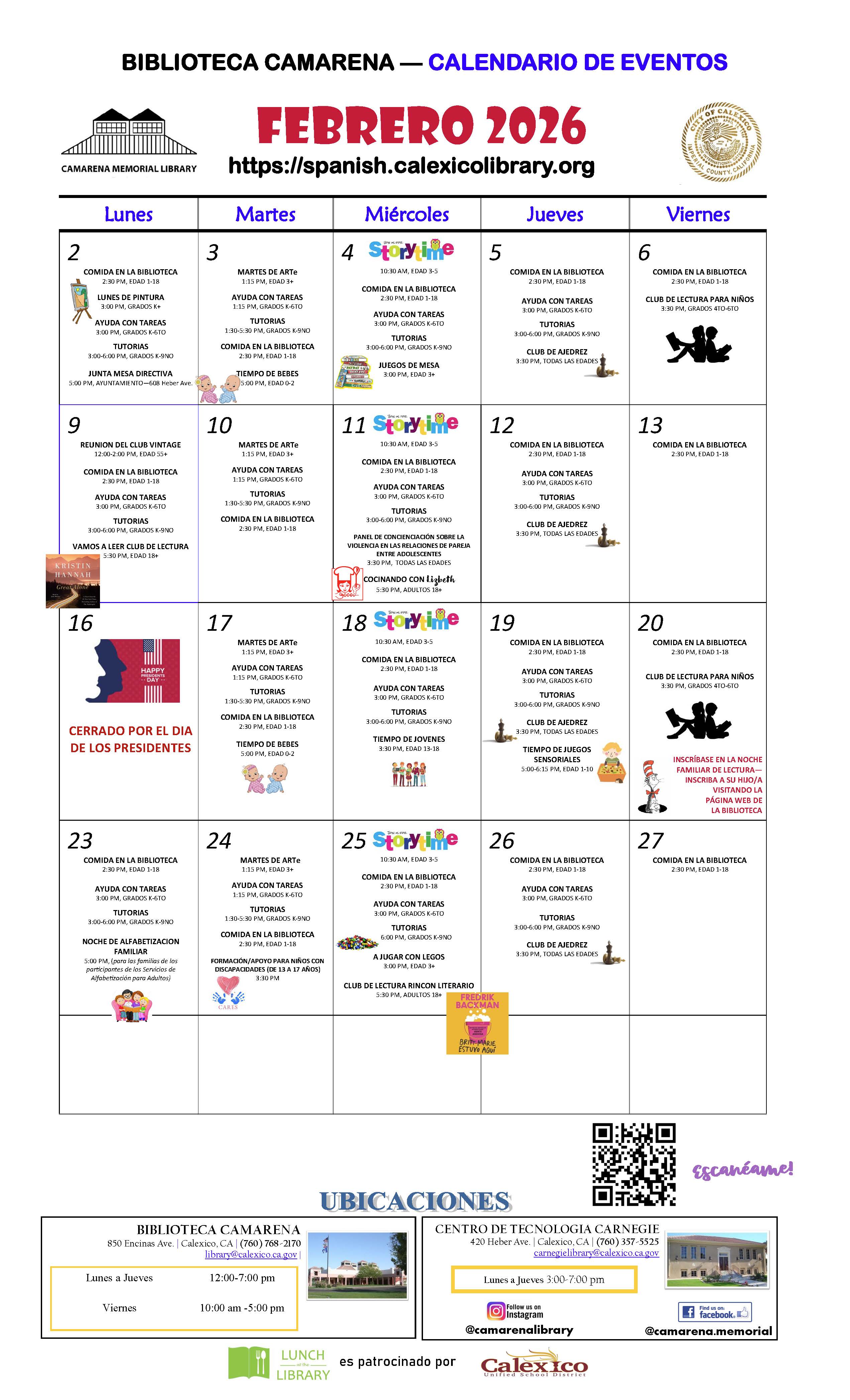 Aqui encontrarás los eventos y programas de la Biblioteca Camarena ubicada en 850 Encinas Ave. Calexico, CA.