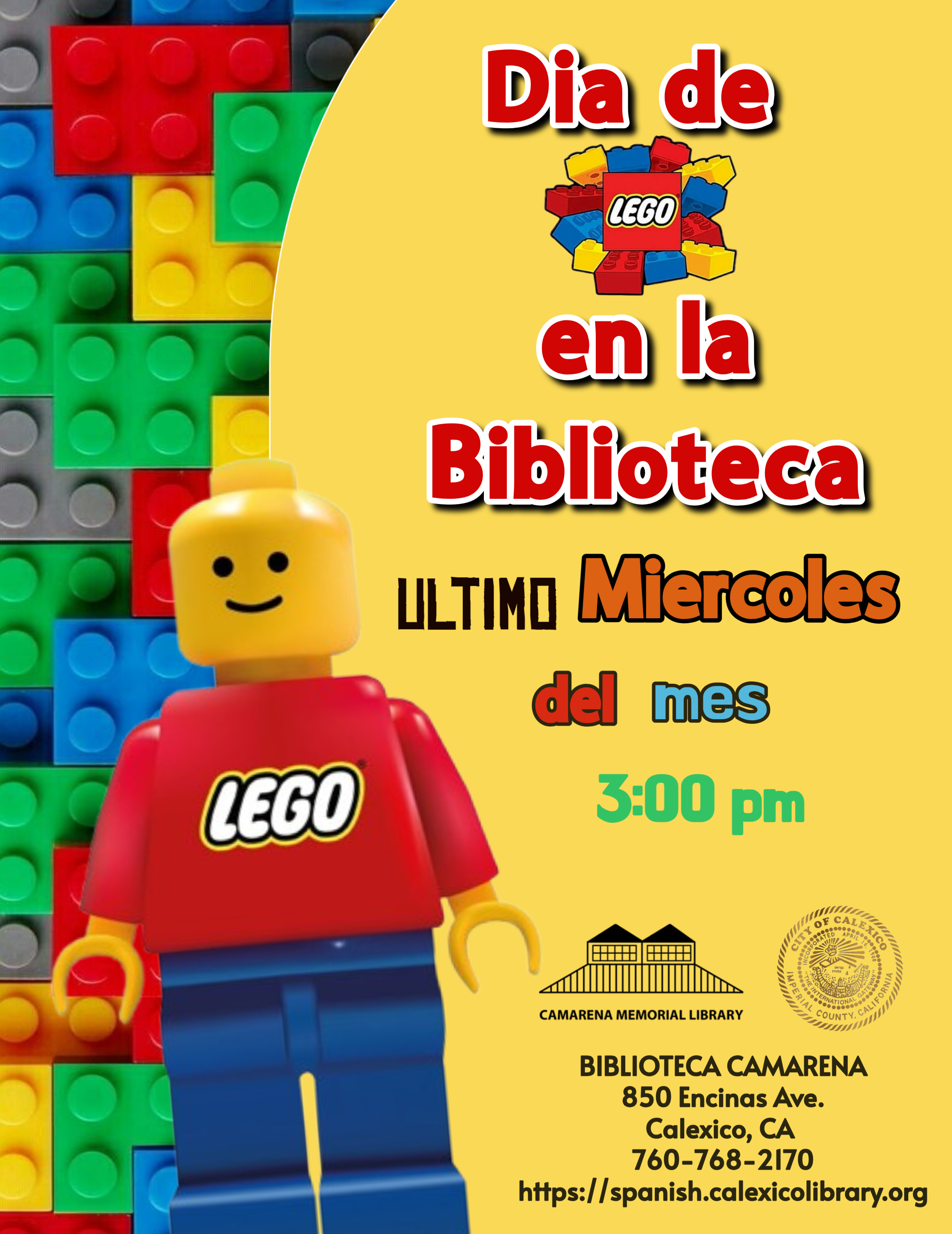 Te invitamos a unirte a nosotros el último miércoles del mes y jugar con ladrillos LEGO. ¡Veamos qué puedes construir! Este programa es para niños mayores de 3 años y sus padres.