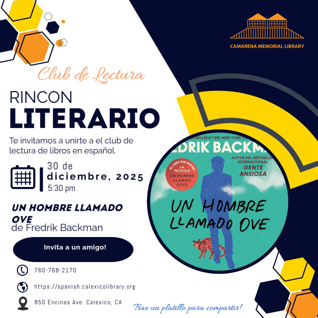 Biblioteca Camarena 850 Encinas Ave. Calexico, CA 92231 United States (760) 768-2170 Fax (760) 357-0404 Tuesday, December 30, 2025 5:30 pm to Tuesday, December 30, 2025 6:30 pm United States Audience Adults