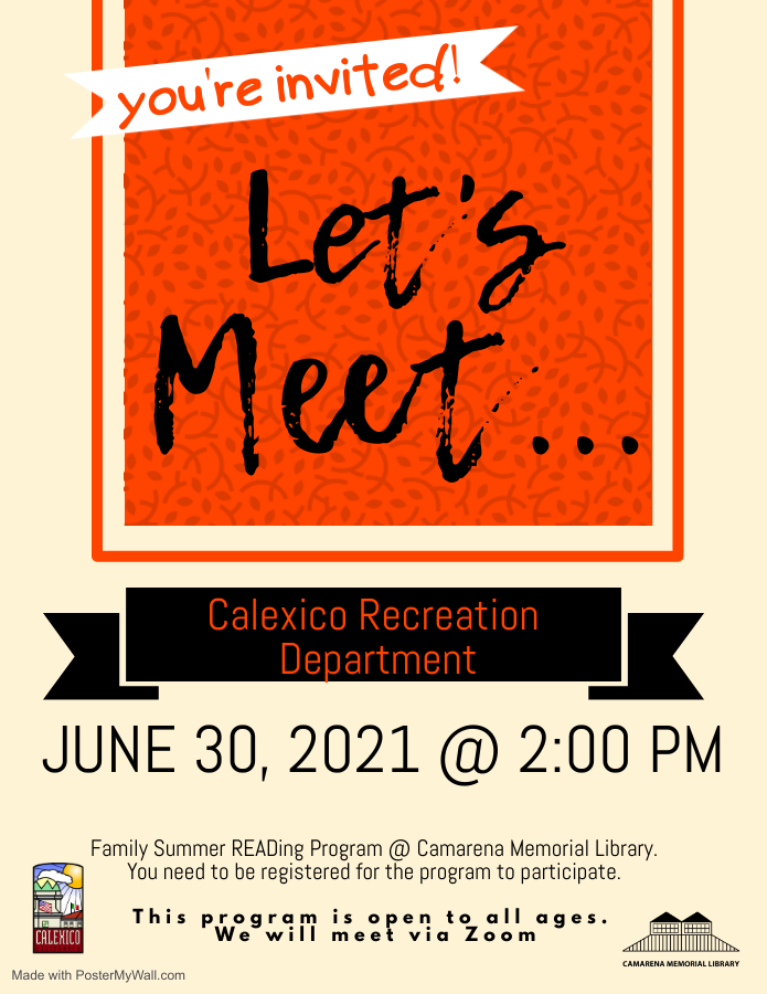 Biblioteca Camarena 850 Encinas Ave. Calexico, CA 92231 United States (760) 768-2170 Fax (760) 357-0404 Wednesday, June 30, 2021 2:00 pm to Wednesday, June 30, 2021 3:00 pm United States Audience Adults Kids Teens