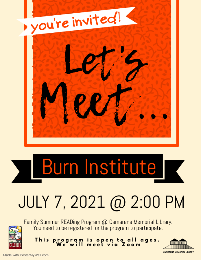 Biblioteca Camarena 850 Encinas Ave. Calexico, CA 92231 United States (760) 768-2170 Fax (760) 357-0404 Wednesday, July 7, 2021 2:00 pm to Wednesday, July 7, 2021 3:00 pm United States Audience Adults Kids Teens