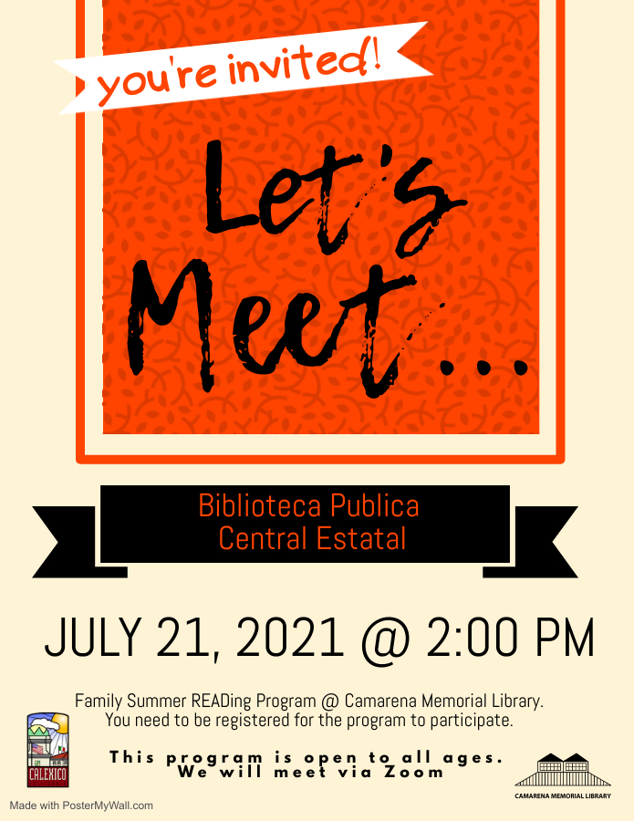 Biblioteca Camarena 850 Encinas Ave. Calexico, CA 92231 United States (760) 768-2170 Fax (760) 357-0404 Wednesday, July 21, 2021 2:00 pm to Wednesday, July 21, 2021 3:00 pm United States Audience Adults Kids Teens