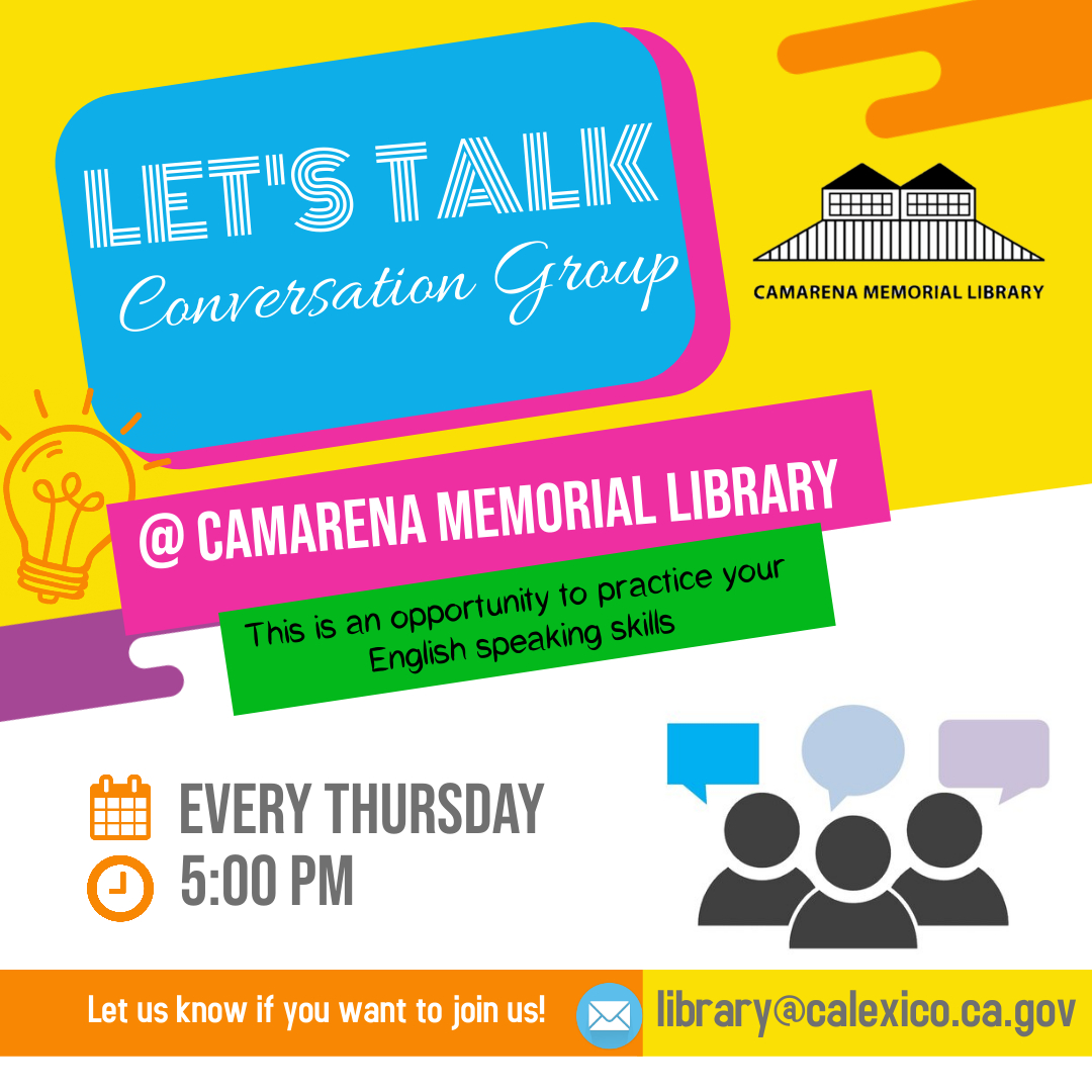 Biblioteca Camarena 850 Encinas Ave. Calexico, CA 92231 United States (760) 768-2170 Fax (760) 357-0404 Thursday, June 10, 2021 5:00 pm to Thursday, June 10, 2021 6:00 pm United States Audience Adults