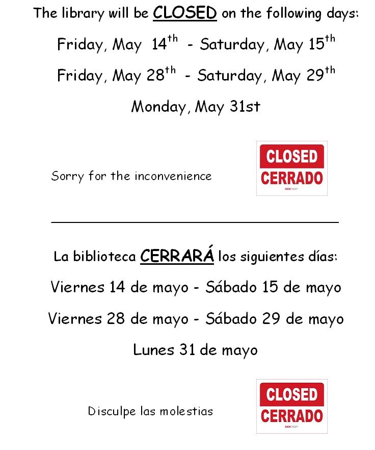 Tuesday, May 4, 2021 2:45 pm to Tuesday, May 4, 2021 3:45 pm United States Attachments Mayclosingsign_0.JPG (68.79 KB)