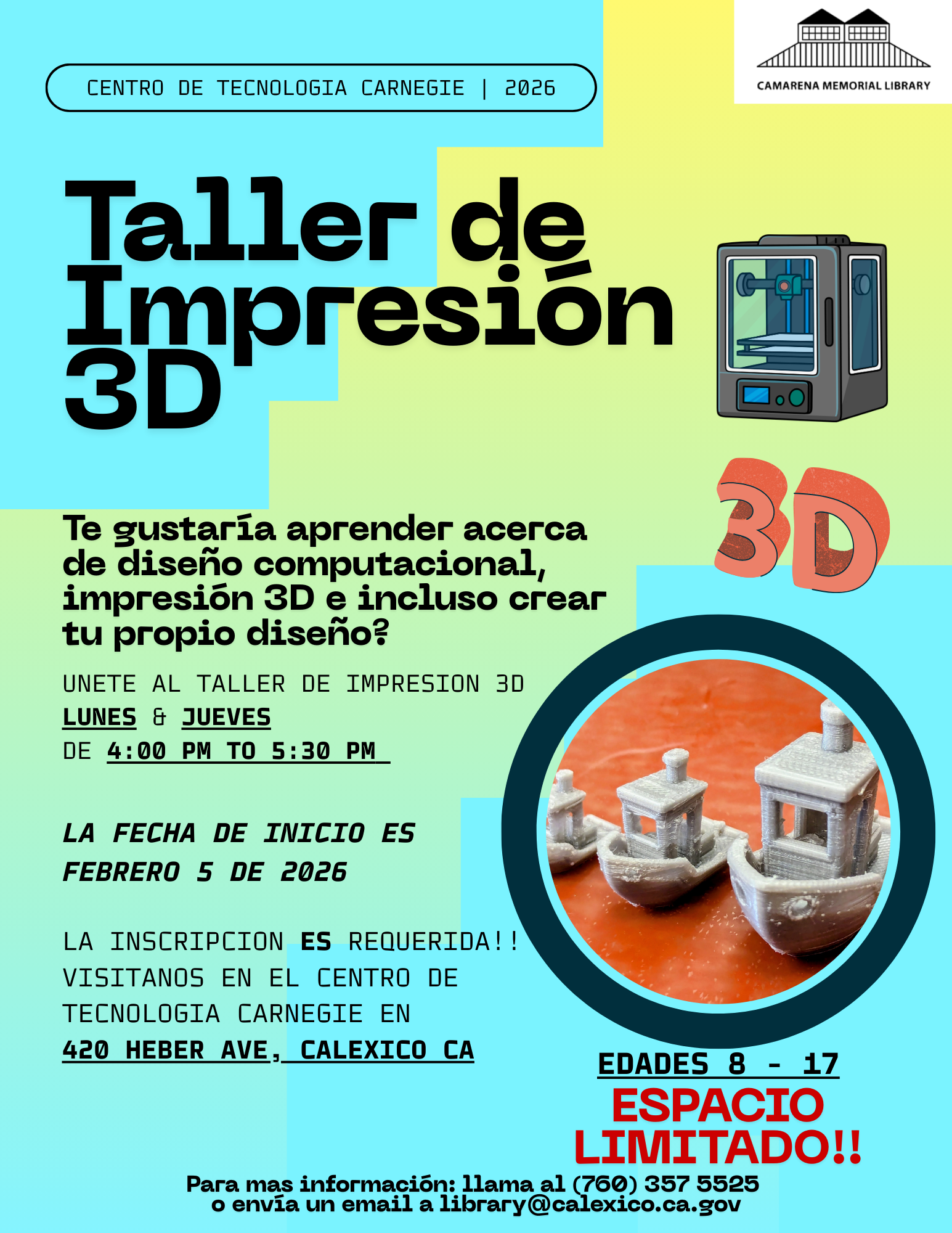 Centro de Tecnología Carnegie 420 Heber Ave. Calexico, CA 92231 United States 760-357-5525 Thursday, February 12, 2026 4:00 pm to Thursday, February 12, 2026 5:30 pm United States Audience Kids Teens