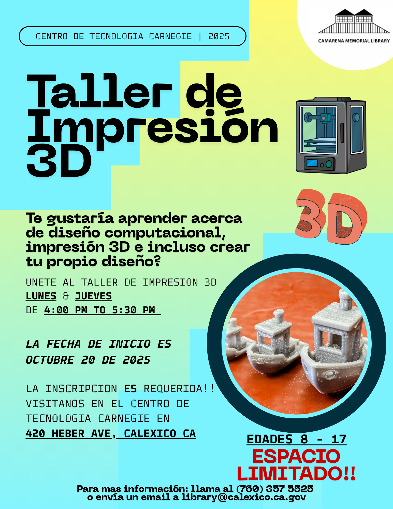 Centro de Tecnología Carnegie 420 Heber Ave. Calexico, CA 92231 United States 760-357-5525 Thursday, October 30, 2025 4:00 pm to Thursday, October 30, 2025 5:30 pm United States Audience Teens